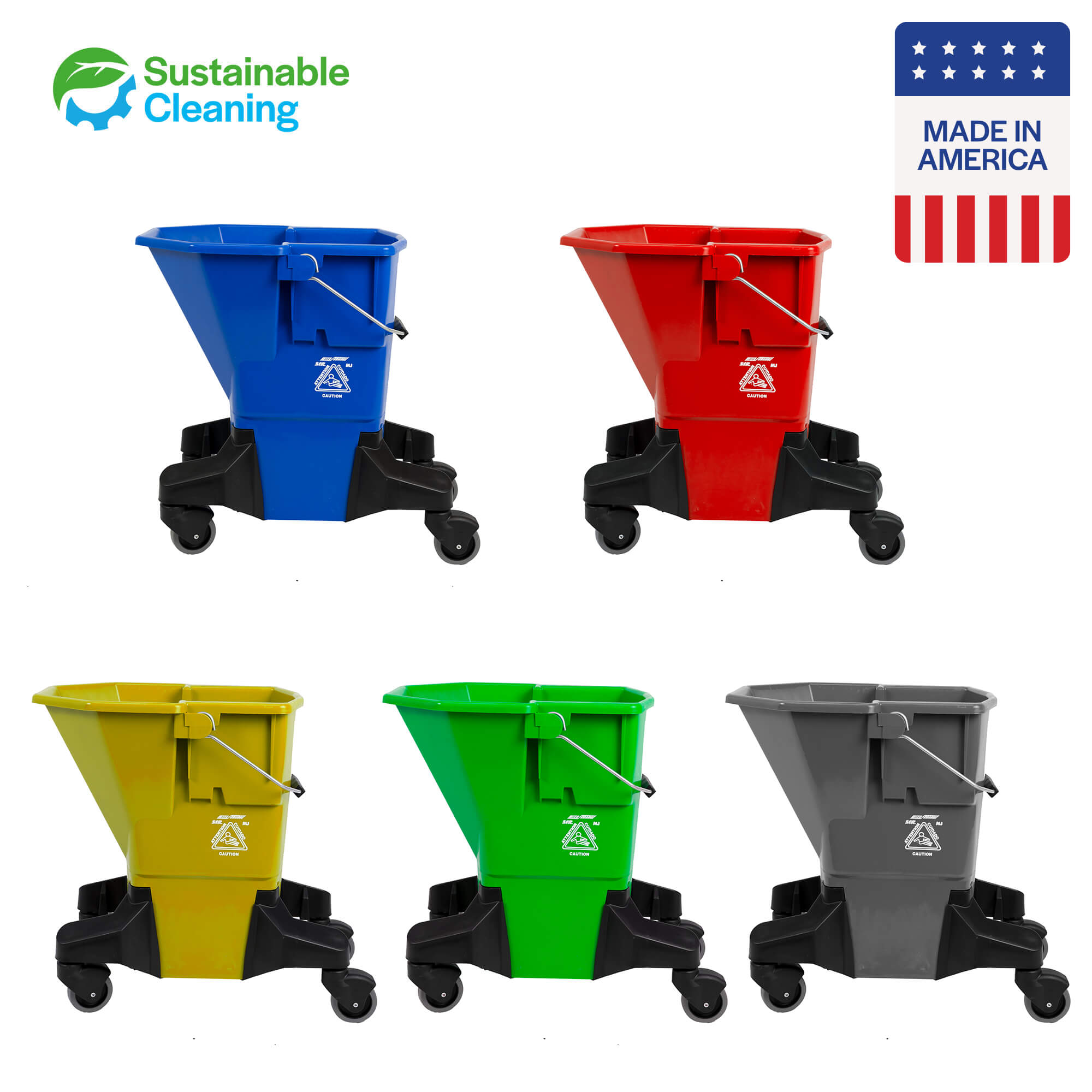 Durable mop bucket with a strong pick up and go handle and super quiet 80mm swivel castors. Tough polymer construction. Contains 30% recycled plastic, multi lingual side print. Wringer sold separately.